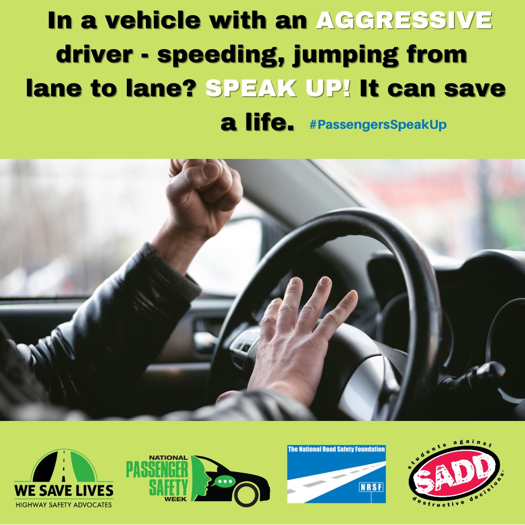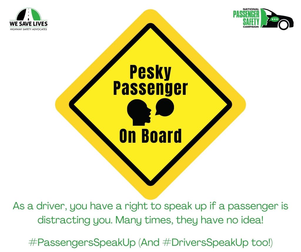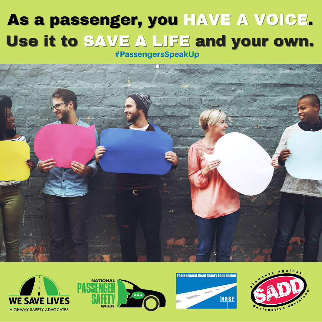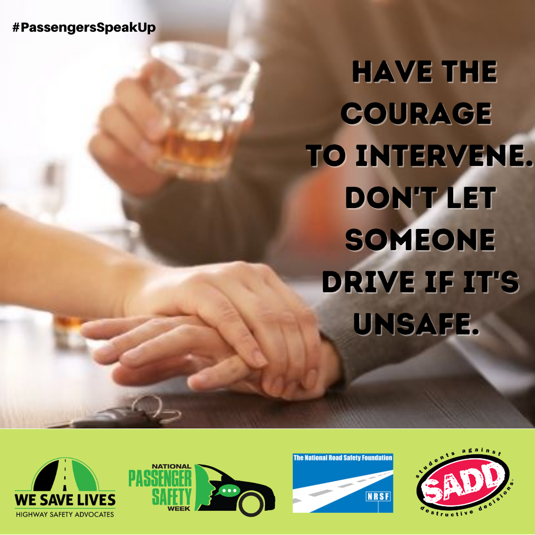 Please choose from the following hashtags: #WeSaveLives #CouragetoIntervene #PassengerSafety #CrashIntervention #NationalPassengerSafety #NPSW #PassengersSpeakUp #NRSFsquad #backseatdriver #beabackseatdriver #beabackseatbrat and tag us on social media @WeSaveLives @NRSForg