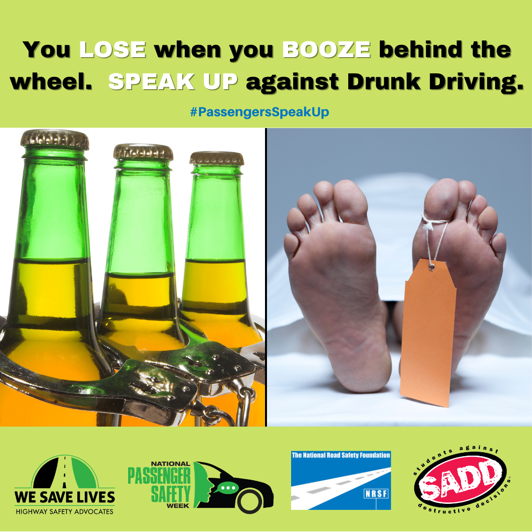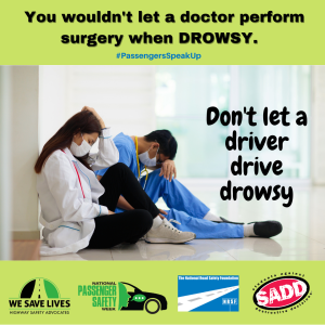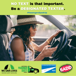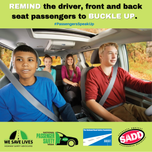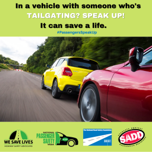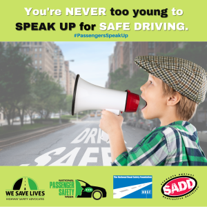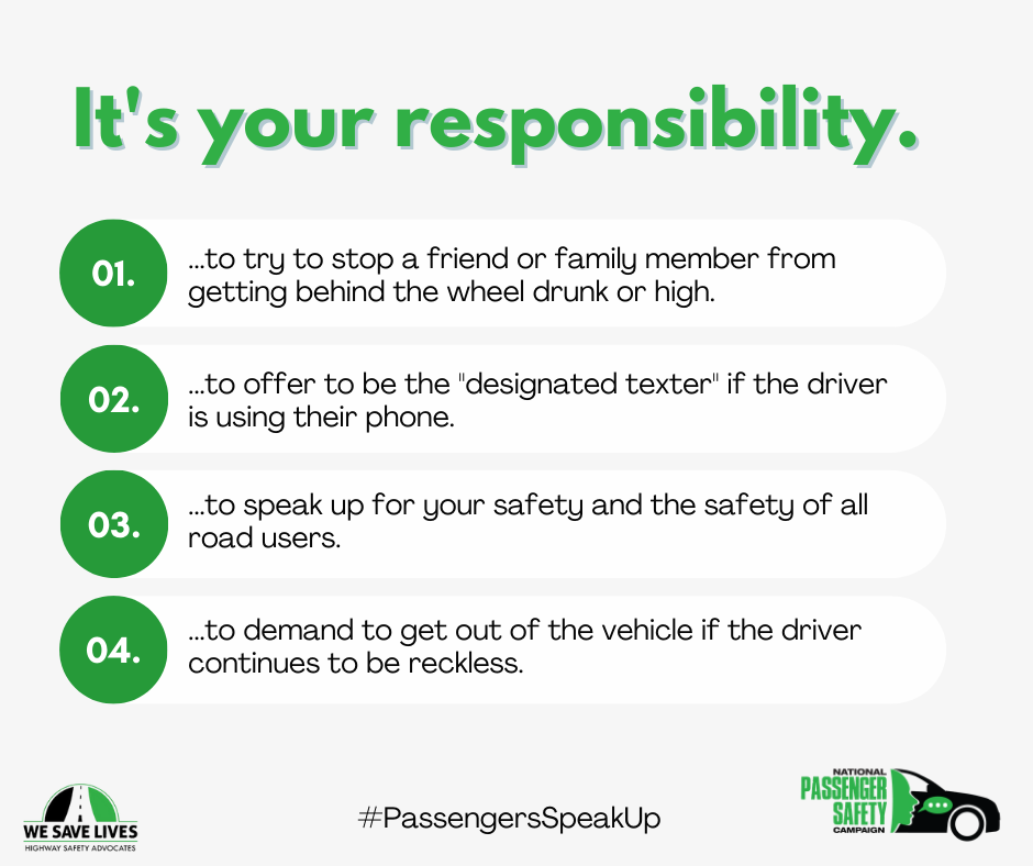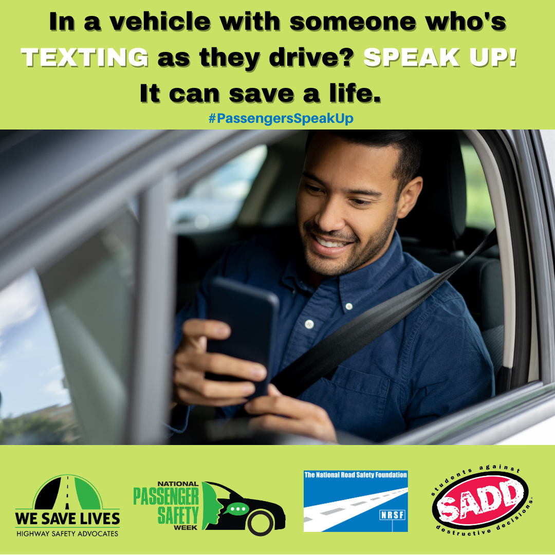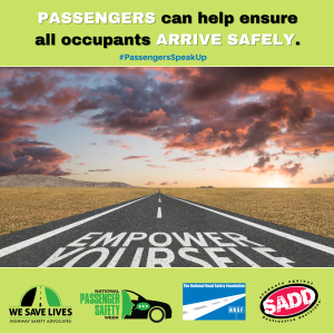 Please choose from the following hashtags: #WeSaveLives #CouragetoIntervene #PassengerSafety #CrashIntervention #NationalPassengerSafety #NPSW #PassengersSpeakUp #NRSFsquad #backseatdriver #beabackseatdriver #beabackseatbrat and tag us on social media @WeSaveLives @NRSForg